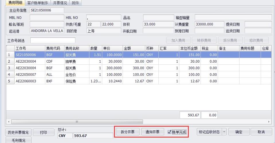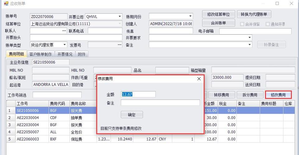 對賬出現的問(wèn)題可以在“費用明細”界面選中費用,點(diǎn)擊右側中間位置的【修改費用】按鈕,賬單確認無(wú)誤的,可以勾選【賬單完成】,并點(diǎn)擊【通知開(kāi)票】或【拆分開(kāi)票】。如圖(8)、圖(9)