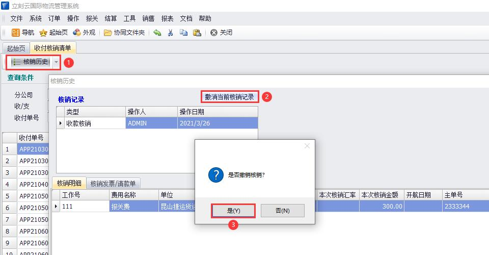 立刻云貨代軟件中依次點(diǎn)擊【結算】—【收付核銷(xiāo)清單】,通過(guò)條件檢索出需要修改的核銷(xiāo)記錄,選中該條記錄點(diǎn)擊①【核銷(xiāo)歷史】,點(diǎn)擊②【撤銷(xiāo)當前核銷(xiāo)記錄】,接著(zhù)點(diǎn)擊③【確定】。如圖(1)