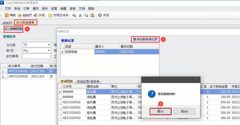 首先,我們需要將已核銷(xiāo)的發(fā)票取消核銷(xiāo),立刻云貨代系統中依次點(diǎn)擊【結算】—【收付核銷(xiāo)清單】,通過(guò)條件檢索出需要修改的核銷(xiāo)記錄,選中該條記錄點(diǎn)擊①【核銷(xiāo)歷史】,點(diǎn)擊②【撤銷(xiāo)當前核銷(xiāo)記錄】,接著(zhù)點(diǎn)擊③【確定】。如圖(1)