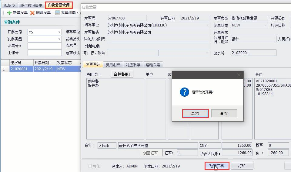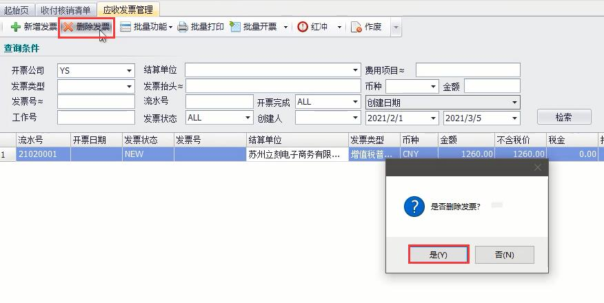 然后,需要取消開(kāi)票和刪除發(fā)票,依次點(diǎn)擊【結算】—【應收發(fā)票管理】,通過(guò)條件檢索出對應發(fā)票,雙擊打開(kāi),點(diǎn)擊【取消開(kāi)票】,然后點(diǎn)擊【是】,接著(zhù)點(diǎn)擊【刪除發(fā)票】,然后點(diǎn)擊【是】。如圖(2)、圖(3)