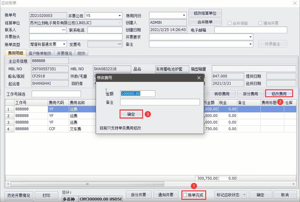 最后,需要解鎖賬單,然后修改費用,依次點(diǎn)擊【結算】—【應收賬單管理】,通過(guò)條件檢索出對應賬單,并雙擊打開(kāi),點(diǎn)擊取消①【賬單完成】前的勾,選中需要修改的費用項,點(diǎn)擊②【修改費用】,費用修改好后,點(diǎn)擊③【確定】即可。如圖(4)