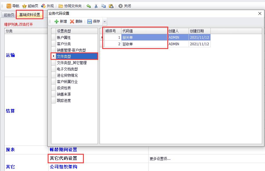 在立刻云貨代系統中,依次打開(kāi)【系統】—【基礎資料設置】,雙擊打開(kāi)“其它代碼設置”,選中“文件類(lèi)型”,點(diǎn)擊【新增】按鈕,輸入相應內容后點(diǎn)擊【保存】按鈕即可。如圖(1)