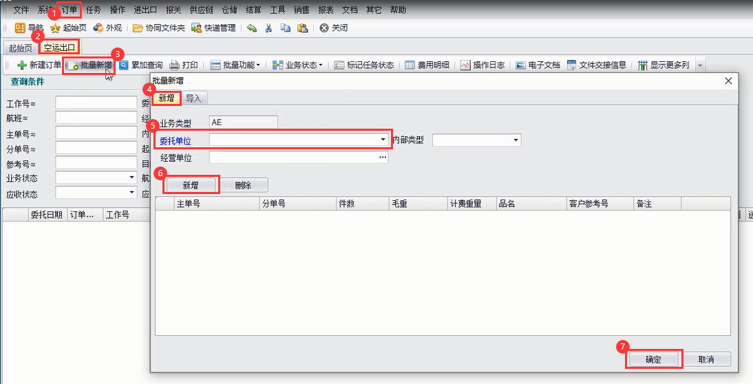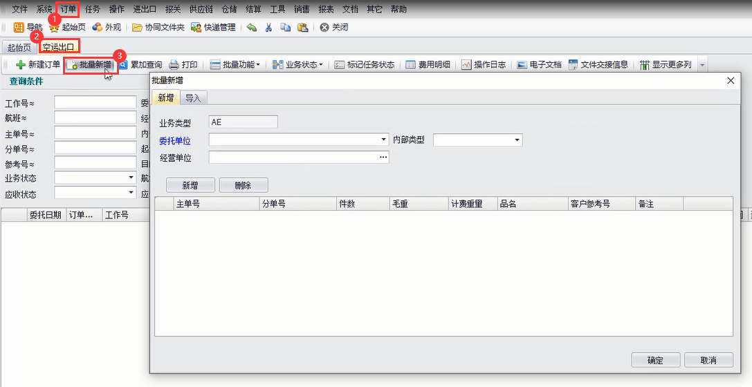 依次點(diǎn)擊【訂單】-【空運出口】,點(diǎn)擊【批量新增】。如圖(1)