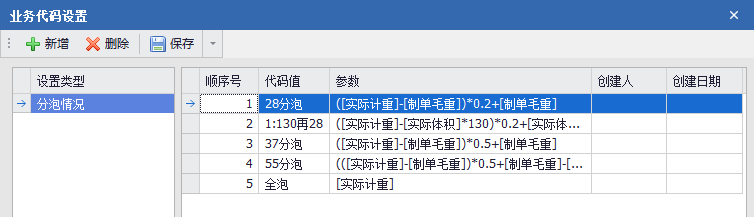 打開(kāi):“系統”-“基礎資料設置”,雙擊:分泡情況,在彈出分泡情況的設置界面,如圖(1),默認會(huì )按照這5種情況進(jìn)行分類(lèi),參數中也默認填寫(xiě)了不同分泡情況下“應收計費重量”的計算公式。
