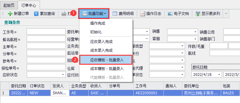 以“應收模板錄入”做示范,我們打開(kāi):“訂單”-“訂單中心”,點(diǎn)擊【檢索】按鈕,檢索到訂單,選中一票或多票訂單,如圖(2),然后點(diǎn)擊上方按鈕 ①【批量功能】- ②【應收模版 – 批量錄入】