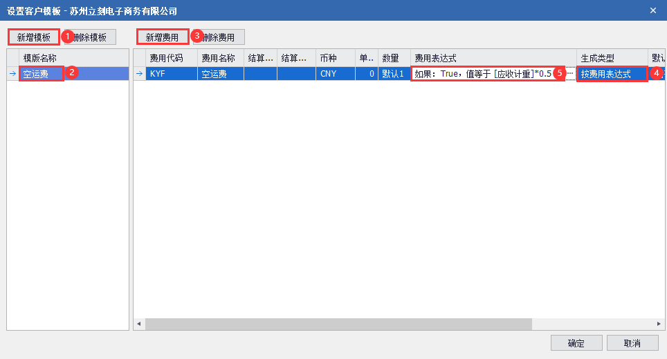 然后如圖(4),點(diǎn)擊 ①【新增模版】新增一個(gè)名為 ②“空運費”的客戶(hù)模版,接著(zhù)選中這個(gè)模版,再右側點(diǎn)擊 ③【新增費用】,新增一條空運費,④ 生成類(lèi)型選擇“按費用表達式”,⑤ 表達式的結果就是【應收計重】乘以某個(gè)價(jià)格,如果價(jià)格是變動(dòng)的,也可以填寫(xiě)到訂單的附加數據項內,表達式這里可以直接調用過(guò)來(lái)參與計算。