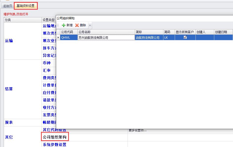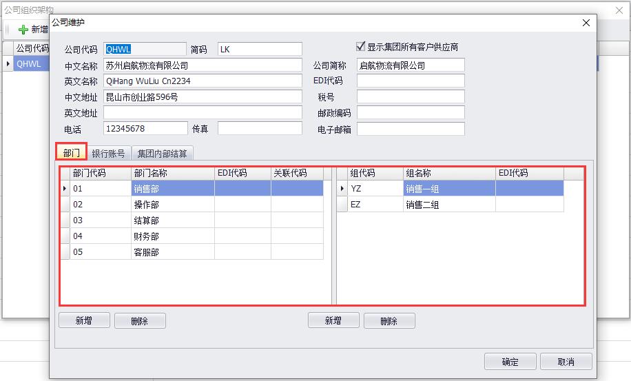 立刻云貨代軟件中依次點(diǎn)擊打開(kāi)【系統】-【基礎資料設置】,雙擊打開(kāi)“公司組織架構”,雙擊需要維護的公司。點(diǎn)擊【新增】按鈕,新增編輯所需部門(mén),選中此部門(mén),點(diǎn)擊【新增】按鈕,增加部門(mén)小組內容。如圖(1)、圖(2)