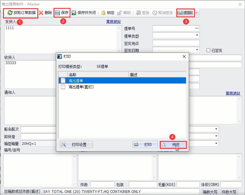 在此界面點(diǎn)擊①【獲取委托數據】按鈕,編輯好相關(guān)信息后,點(diǎn)擊②【保存】按鈕,點(diǎn)擊③【打印】按鈕,選中所需的打印模板,點(diǎn)擊④【預覽】按鈕。如圖(2)