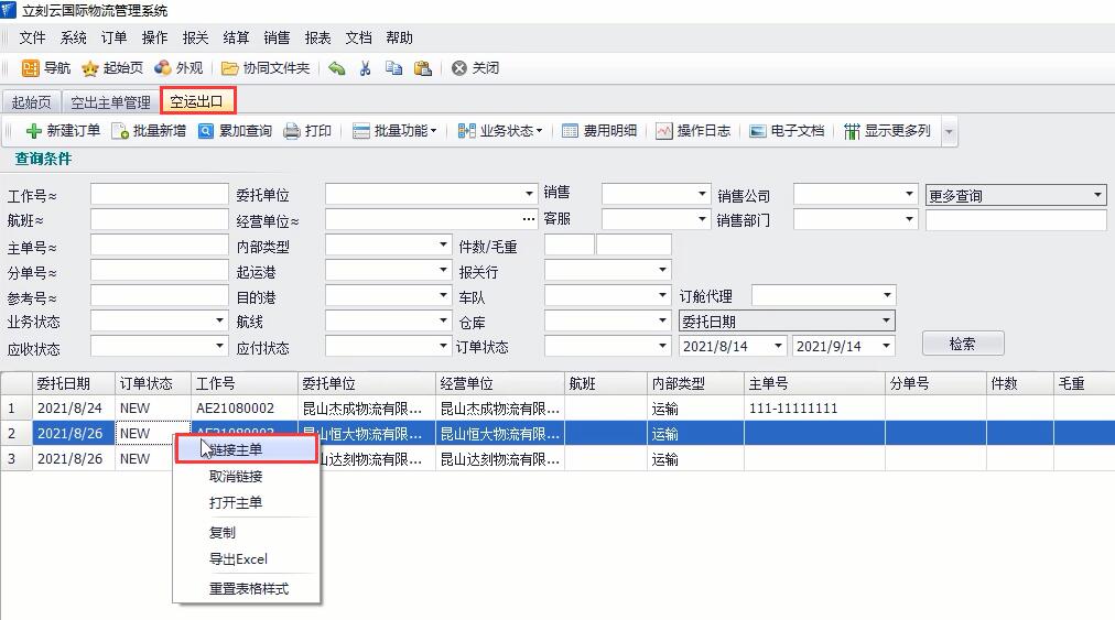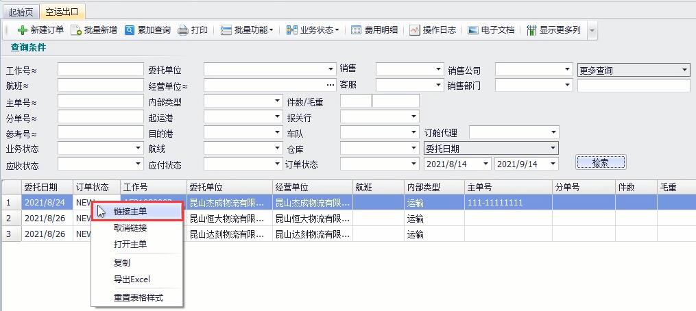 依次點(diǎn)擊【訂單】-【空運出口】,點(diǎn)擊【檢索】按鈕,選擇需要加入主單的工作號信息,鼠標右擊,選擇“鏈接主單”。如圖(1)