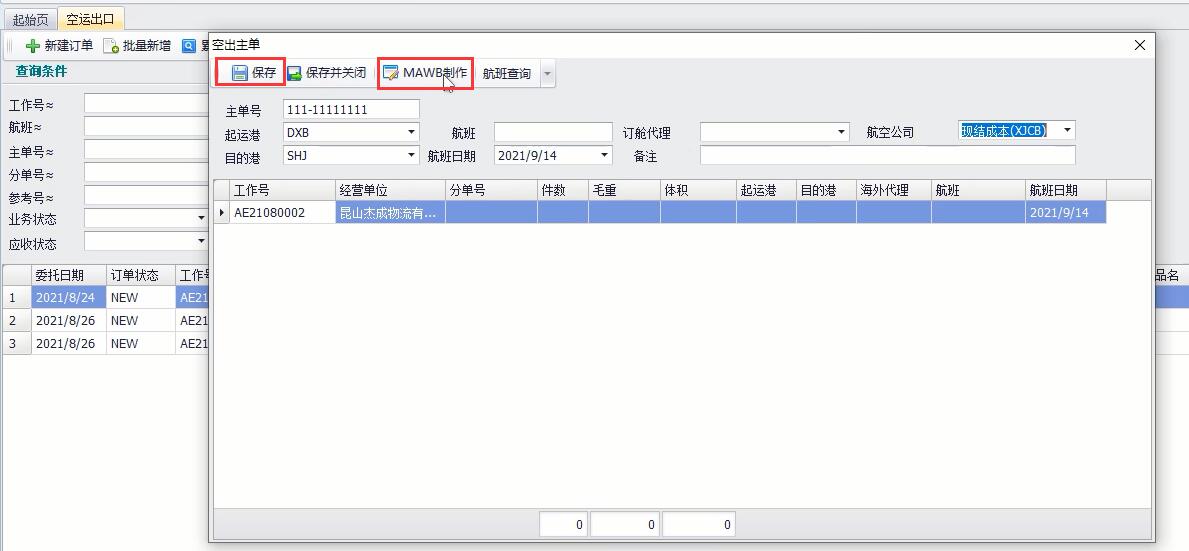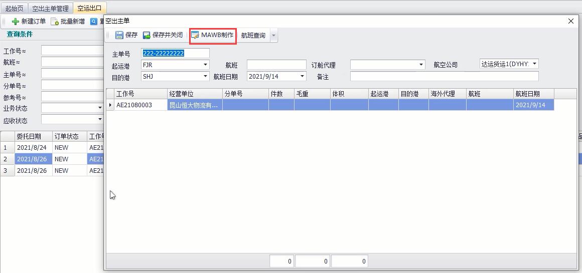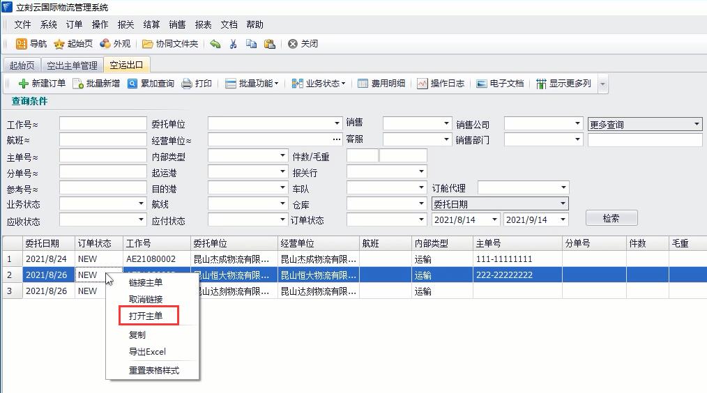 依次點(diǎn)擊【訂單】-【空運出口】,點(diǎn)擊【檢索】按鈕,選擇需要加入主單的工作號信息,鼠標右擊,選擇【鏈接主單】。如圖(2)