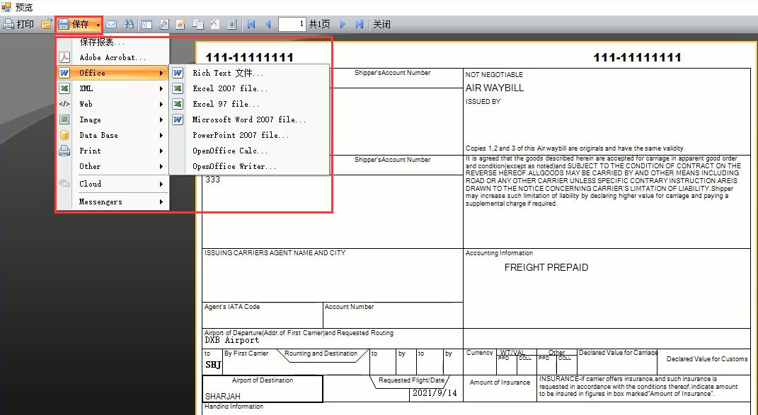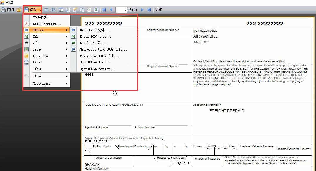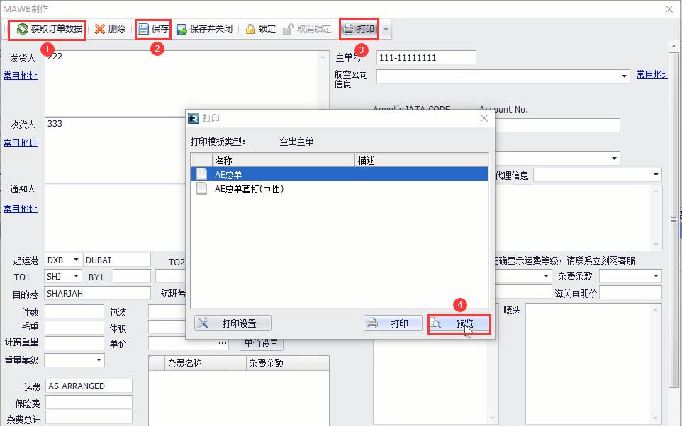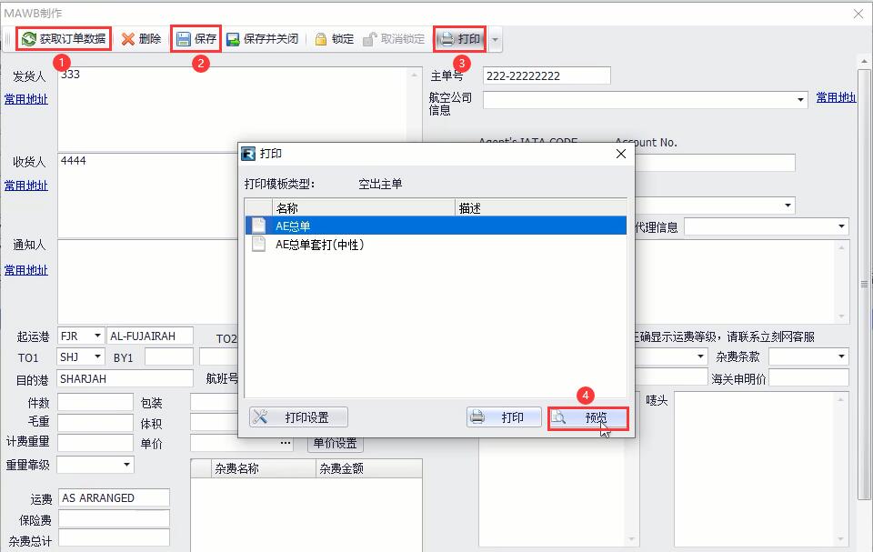 選中關(guān)聯(lián)好的分單,右擊選擇“打開(kāi)主單”,點(diǎn)擊【MAWB制作】按鈕,在此界面點(diǎn)擊①【獲取委托數據】按鈕,編輯好相關(guān)信息后,點(diǎn)擊②【保存】按鈕,點(diǎn)擊③【打印】按鈕,選中所需的打印模板,點(diǎn)擊④【預覽】按鈕,如圖(3)、圖(4)、圖(5)