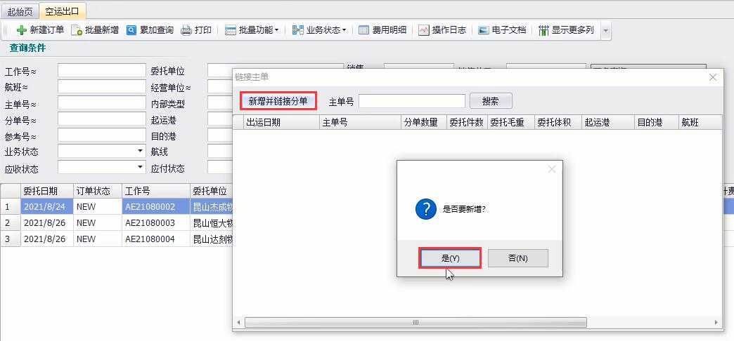在彈出的“鏈接主單”界面中點(diǎn)擊【新增并鏈接分單】按鈕,彈出的對話(huà)框中選擇【是】。如圖(2)