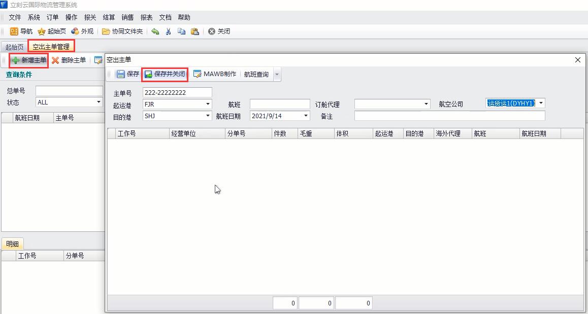 依次點(diǎn)擊【操作】-【空出主單管理】,點(diǎn)擊【新增主單】按鈕,在此界面編輯好相關(guān)信息后點(diǎn)擊【保存并關(guān)閉】按鈕。如圖(1)