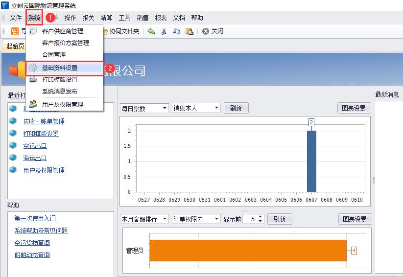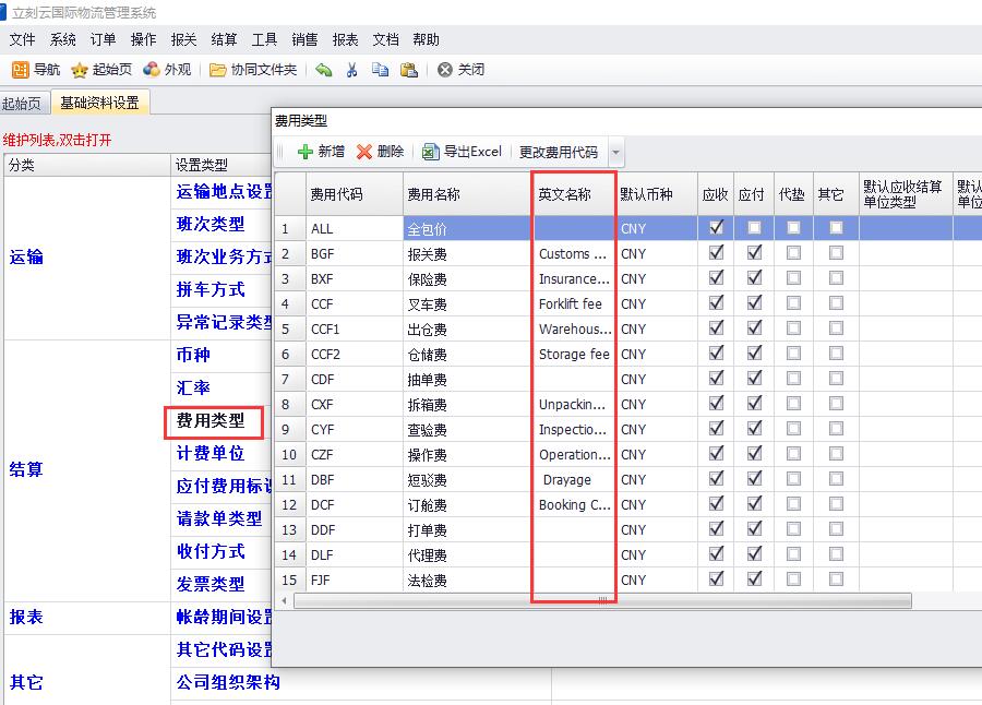 立刻云貨代系統中依次點(diǎn)擊【系統】—【基礎資料設置】,雙擊打開(kāi)【費用類(lèi)型】選項,維護好對應的英文費用名稱(chēng)。如圖(1)、圖(2)