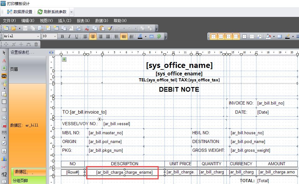 然后再依次打開(kāi)【系統】—【打印模版設置】,找到對應的英文賬單,雙擊打開(kāi)模板,點(diǎn)擊【打印模板設計】,注意查看下名稱(chēng)這一欄的字段代碼是否是?[ar_bill_charge.charge_ename]。如圖(3)圖(3)