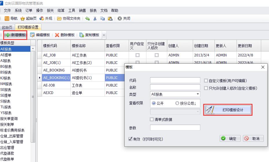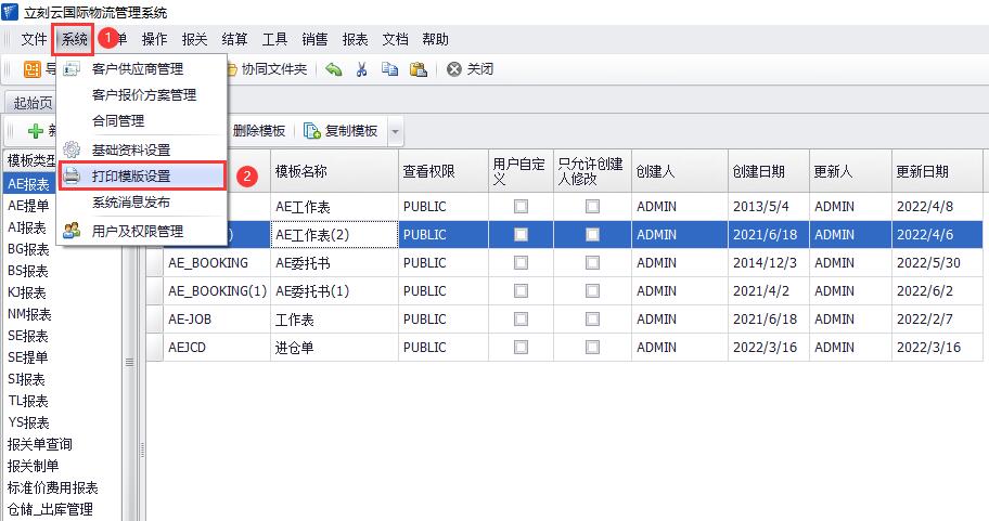 1、在立刻云貨代軟件中依次打開(kāi)①【系統】-②【打印模版設置】,找到需要調整或者新增的報表。如圖(1)
