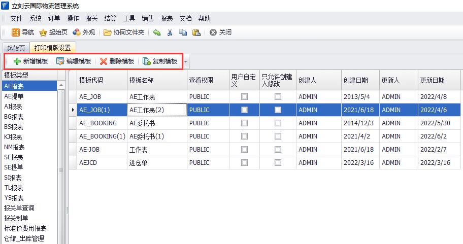 2、本次以:AE報表,即空運出口工作表為例,先點(diǎn)擊【編輯模版】、【新增模版】或【復制模版】。如圖(2)