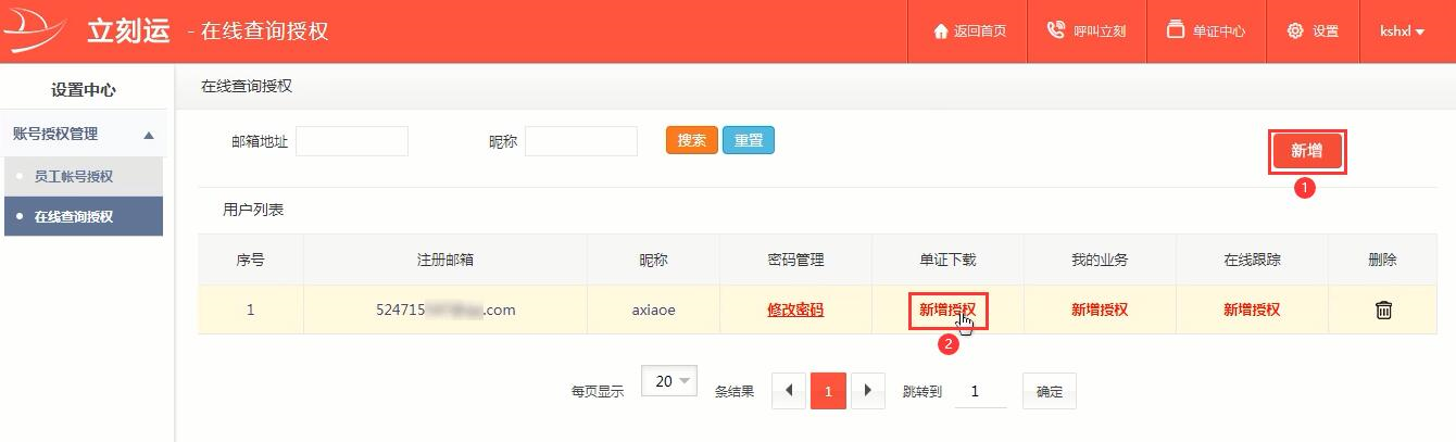 我們先登陸立刻運系統,創(chuàng )建并授權立刻運賬號,先點(diǎn)擊①【新增】按鈕,然后在“單證下載”下方,點(diǎn)擊②“新增授權”,依次授權“報關(guān)單”、“卡口通知書(shū)”和“放行通知書(shū)”,并允許客戶(hù)通過(guò)“主分單號”、“報關(guān)單號”自助查詢(xún)。如圖(1)、圖(2)、圖(3)