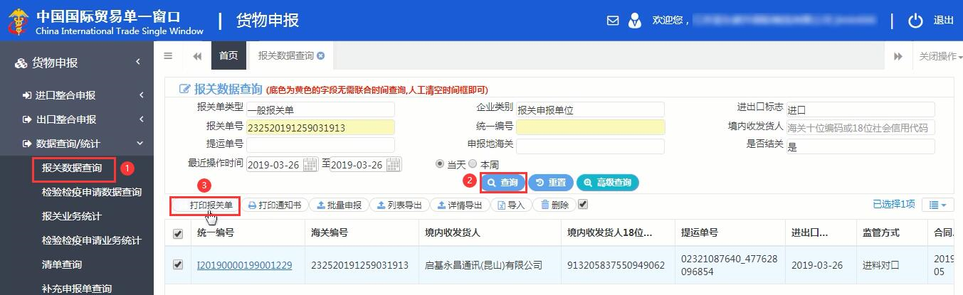 我們打開(kāi)單一窗口,輸入用戶(hù)名和密碼登陸,然后點(diǎn)擊①“報關(guān)數據查詢(xún)”,再點(diǎn)擊【查詢(xún)】按鈕,選中一票報關(guān)數據,點(diǎn)擊【打印報關(guān)單】按鈕。即可依次使用LicPrinte打印機分別打印報關(guān)單和放行通知書(shū)。如圖(4)