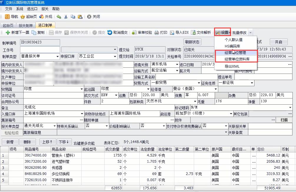 在立刻云貨代系統中,可以事先維護經(jīng)營(yíng)單位信息,依次點(diǎn)擊【設置】—【經(jīng)營(yíng)單位管理】維護完經(jīng)營(yíng)單位后,再依次點(diǎn)擊【設置】—【經(jīng)營(yíng)單位資料庫】,可以維護經(jīng)營(yíng)單位的備案信息和料件信息,形成“料件庫”,方便后續導入模板時(shí)自動(dòng)調用。如圖(1)