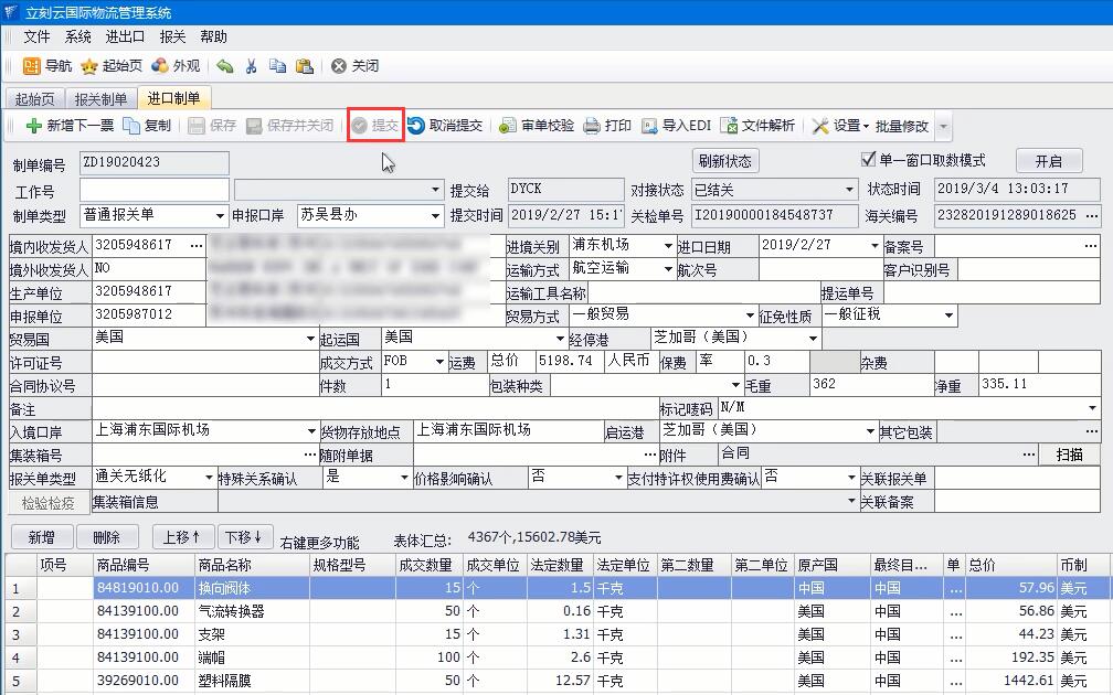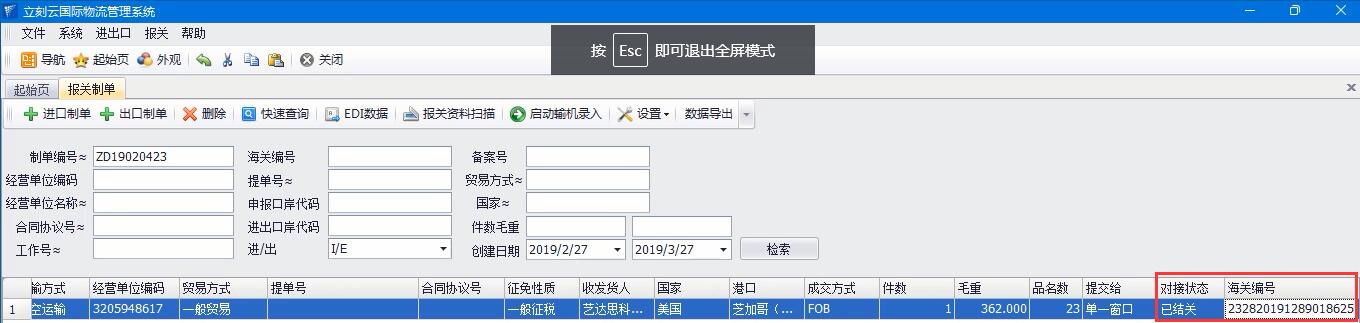 審單通過(guò)后可以點(diǎn)擊【提交】按鈕,將申報數據提交至單一窗口進(jìn)行報關(guān),申報狀態(tài)也會(huì )通過(guò)接口回傳至簡(jiǎn)單報系統內。如圖(10)、圖(11)