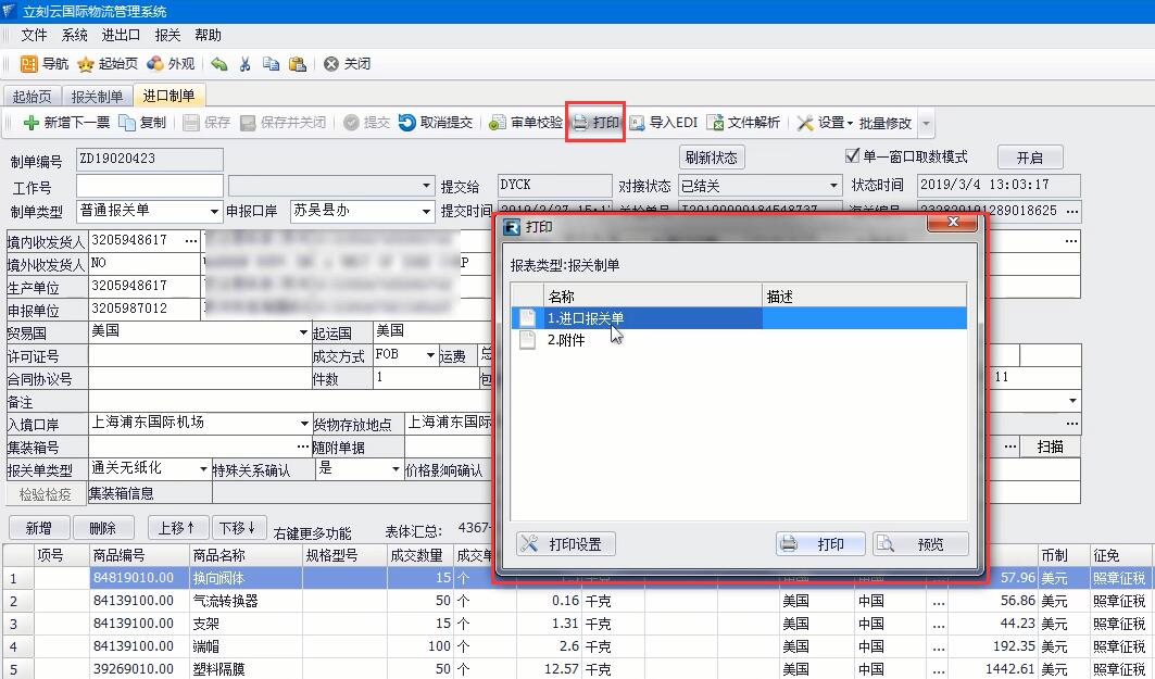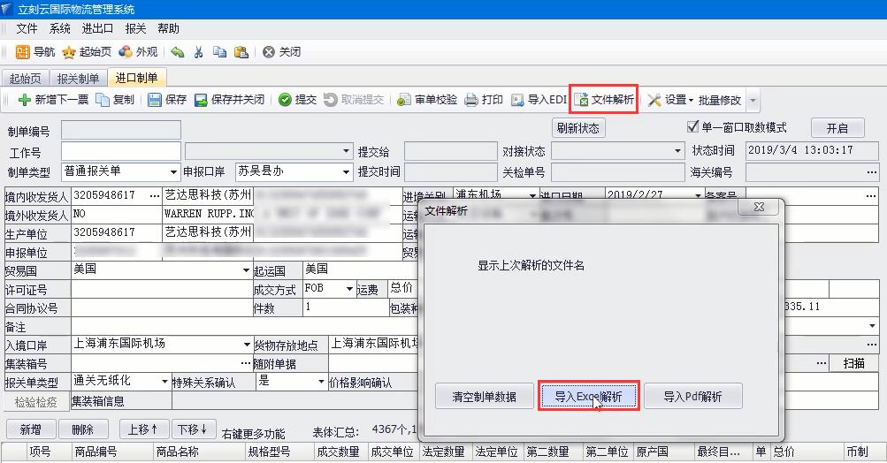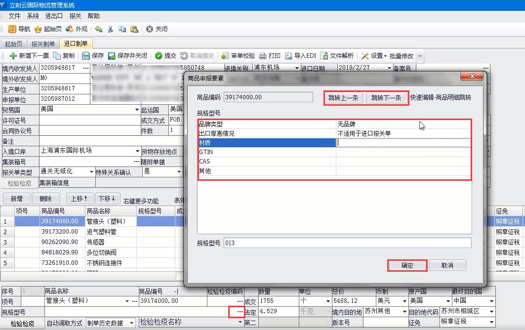 登陸系統后,點(diǎn)擊【報關(guān)】—【報關(guān)制單】—【進(jìn)口制單】,選擇“文件解析”,點(diǎn)擊【導入Excel解析】找到本次需要報關(guān)的發(fā)票、箱單、托書(shū)等Excel格式的文件,選擇對應的解析方案后,系統會(huì )自動(dòng)解析出Excel表格中的內容,在表體部分我們可以選擇第一條,然后依次維護申報要素,系統已經(jīng)內置標準版HS編碼庫可供參考。如圖(2)、圖(3)