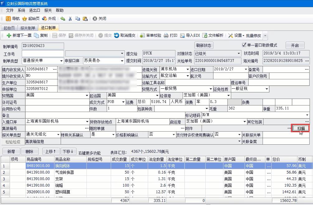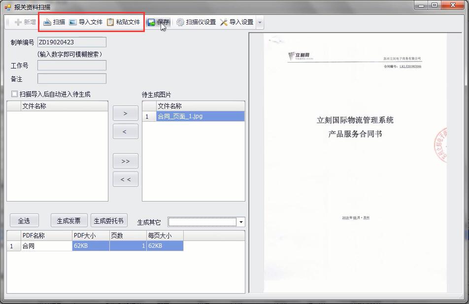 制單信息保存后,點(diǎn)擊【掃描】按鈕添加隨附單據,可以?huà)呙栉募?,也可以導入文件,非??旖莸纳煞虾jP(guān)要求的發(fā)票、箱單、托書(shū)、合同等PDF格式。如圖(4)、圖(5)、圖(6)、圖(7)