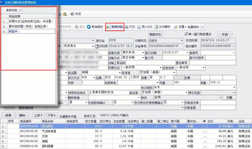 制單完成后可以點(diǎn)擊【打印】按鈕,導出報關(guān)單草單,并人工審單,或直接點(diǎn)擊【審單校驗】按鈕,系統會(huì )根據內置規則,或貴司自定義規則進(jìn)行自動(dòng)審單。當然,我們更加推薦兩者結合的組合審單。如圖(8)、圖(9)